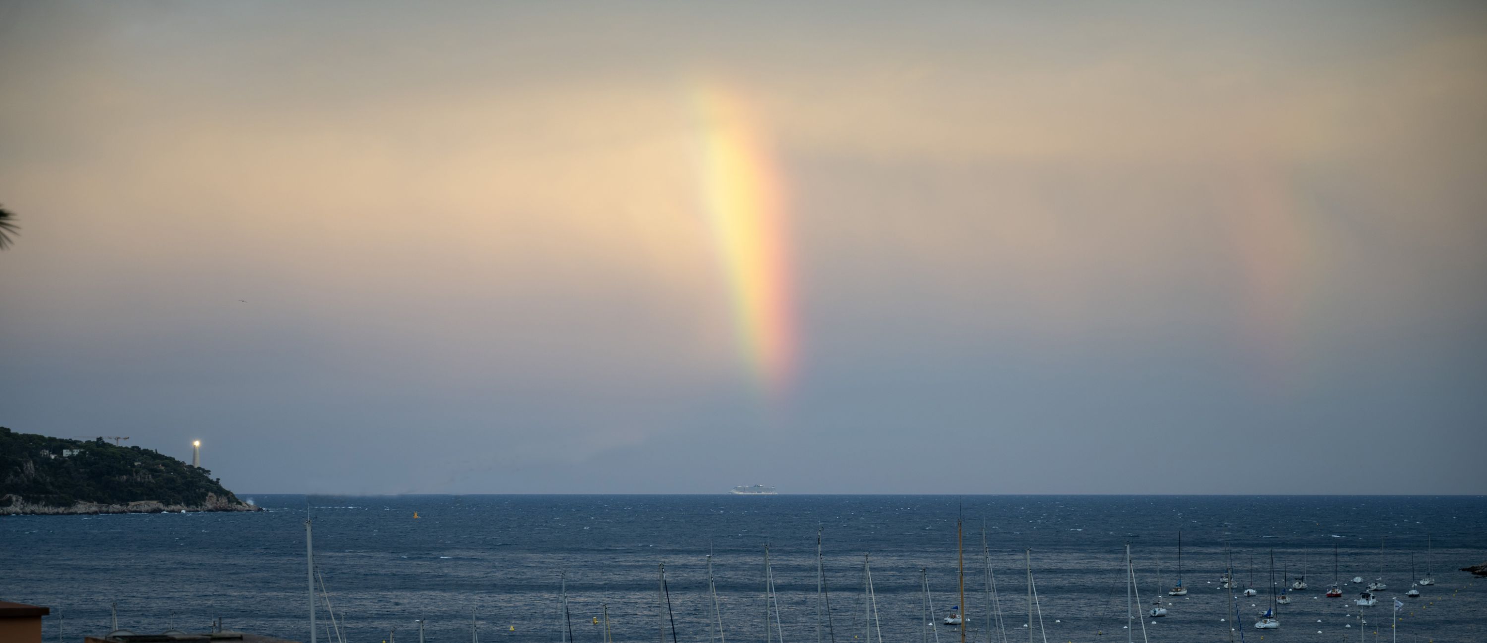 Dimanche 6 Juillet 2025 en soirée: arc en ciel sur la mer, et l'éclat du phare du Cap Ferrat